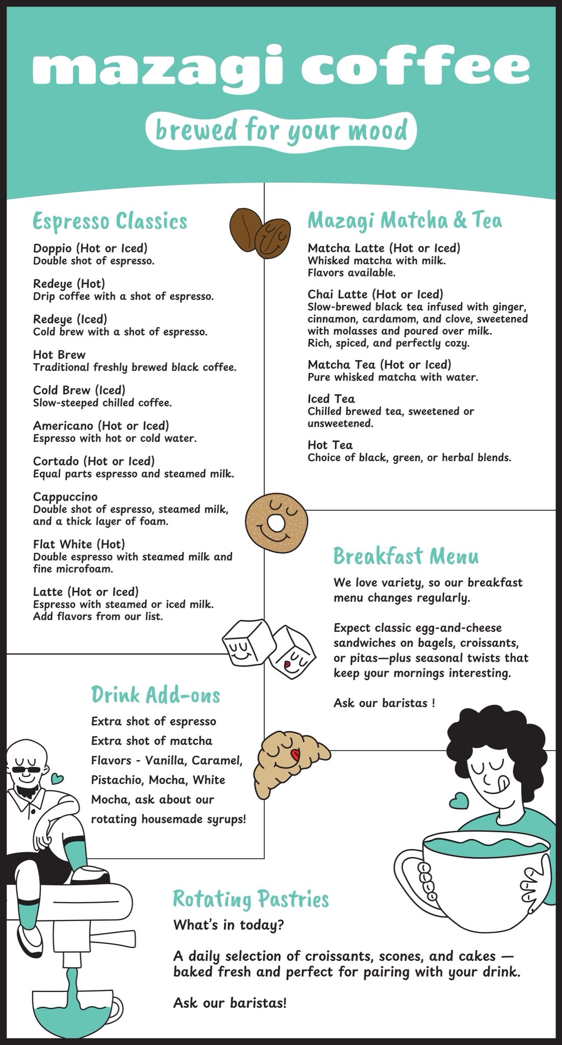 Don't forge our seasonal rotating selection of pastries, like croissants, scones and cakes – perfect for pairing with your favorite Mazagi drink!